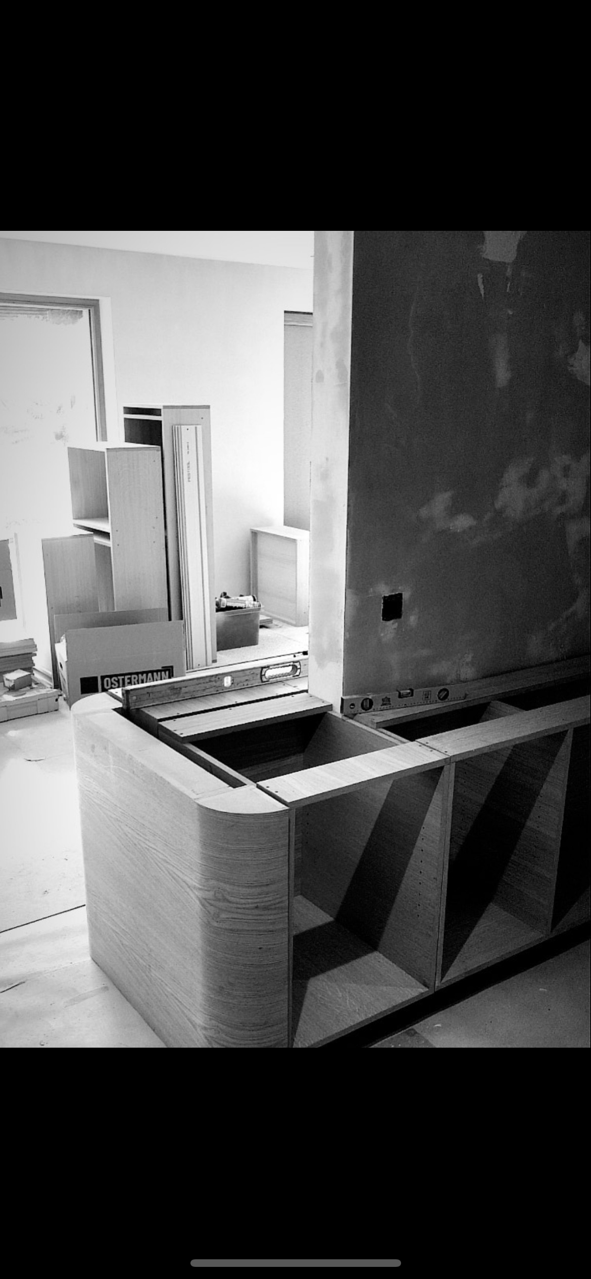 Maatwerk keuken en kookeiland in eik fineer met Mortex, afgewerkt met organische vormen.